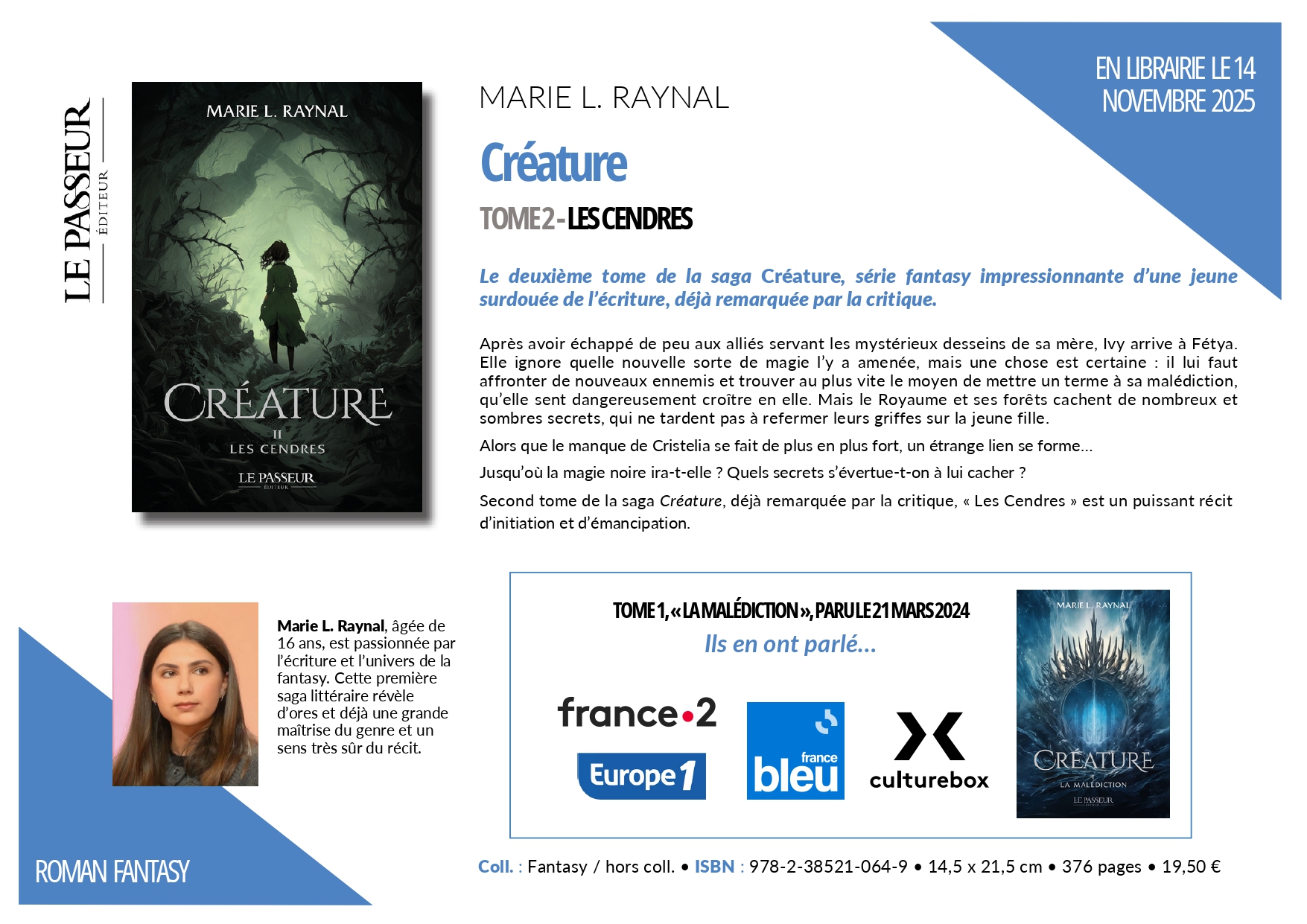 Élève de seconde européenne au lycée Isaac-de-l’Étoile, Marie L. Raynal signe son premier roman, « Créature - La Malédiction ». Marie L. Raynal est élève de seconde européenne au lycée Isaac-de-l’Étoile. Elle est aussi une jeune écrivaine. Son premier roman Créature - La Malédiction (tome 1), paru chez Le Passeur éditeur, vient tout juste de sortir en librairie ce jeudi 21 mars 2024.