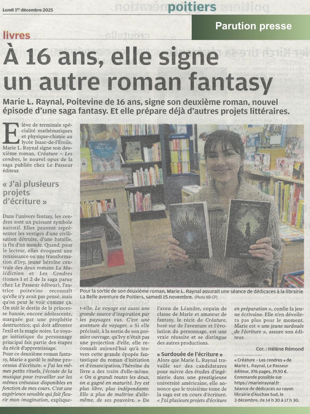 "Poitiers : l’autrice poitevine Marie L. Raynal, 16 ans, revient avec un deuxième roman fantasy envoûtante".